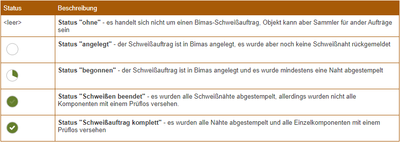 Jeder einzelne Bimasauftrag hat einen Statuswert, welcher durch die nachfolgenden Symbole spezifiziert wird. Hat ein Tabelleneintrag keinen Status, so handelt es sich um keinen in Bimas hinterlegten Auftrag, der Eintrag kann aber als Sammelobjekt für weitere Aufträge dienen.