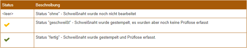 gekennzeichnet. Mittels Klick auf dieses Symbol öffnet sich ein Dialog mit entsprechenden Informationen zur WPS. Die Statusspalte in dieser Tabelle liefert Informationen über den Abarbeitungsstand der jeweiligen Naht (siehe Tabelle). Mit Auswahl einer Naht werden in der rechten unteren Tabelle (4) die Stempelungen geladen, welche auf dieser Naht bereits durchgeführt wurden