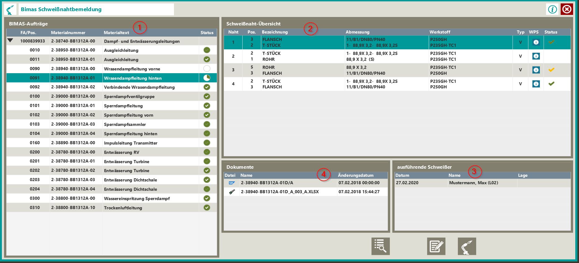 Nach Auswahl eines Bimasauftrags werden in der rechten oberen Tabelle (2) alle für diesen Auftrag hinterlegten Schweißnähte mit den zu verbindenen Positionen geladen. Ist zu der jeweiligen Naht eine WPS hinterlegt, so wird dies durch das Symbol