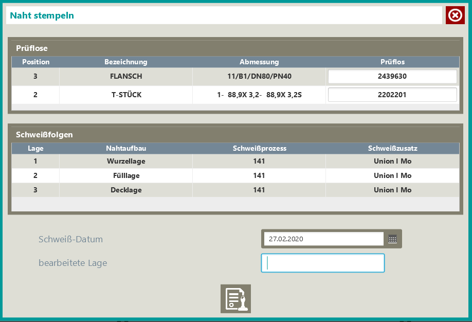 Dabei gilt grundsätzlich, dass systemseitig eine Schweißnaht als fertig geschweißt angenommen wird, sobald ein Mitarbeiter diese Naht gestempelt hat. Es ist durchaus möglich, dass der Naht noch weitere Lagen hinzugefügt werden müssen, dies obliegt aber der Verantwortung des Schweißfachpersonals.