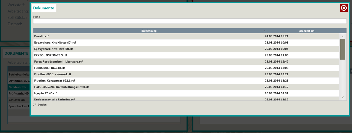 Wenn der Eintrag auf einen Ordner verlinkt ist, wird ein weiterer Auswahldialog angezeigt mit allen Dokumenten in diesem Ordner. Über das Eingabefeld "Suche" kann nach bestimmten Dokumenten gefiltert werden. Doppelklick öffnet das Dokument.