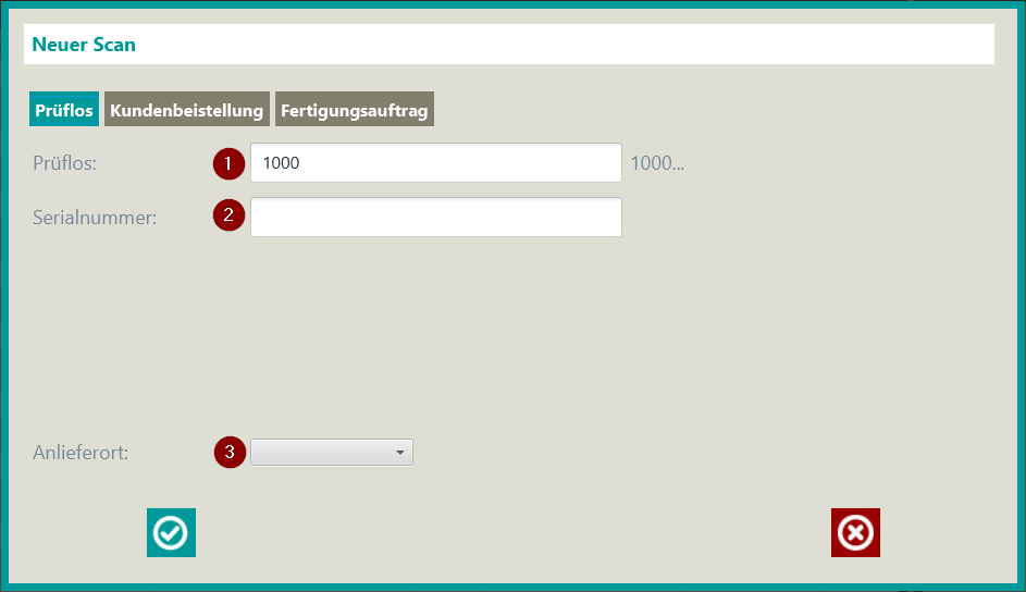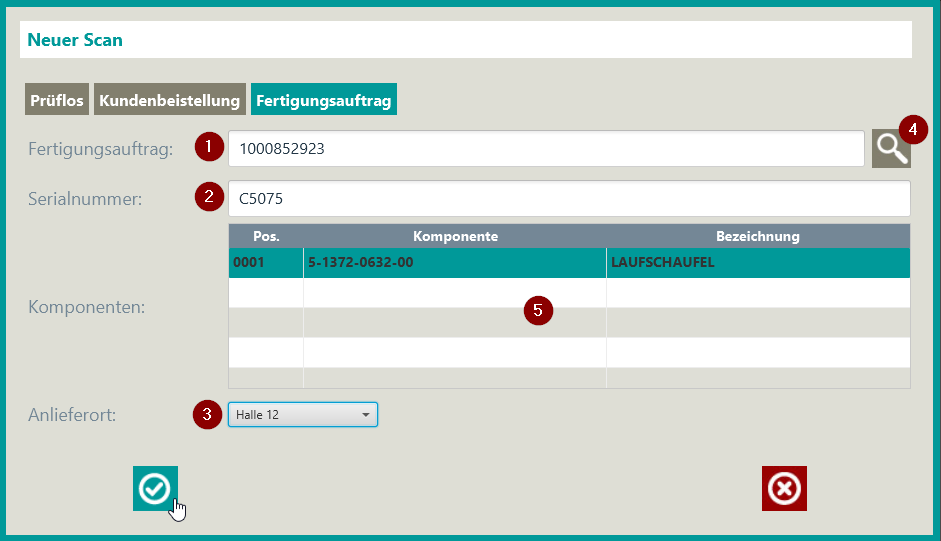 • Anlegen von neuen Scanaufträgen für Prüflos (wenn noch kein Fertigungsauftrag existiert) / Kundenbeistellung (freie Eingabe von PSP, Materialnummer, Serialnummer) / Fertigungsauftrag