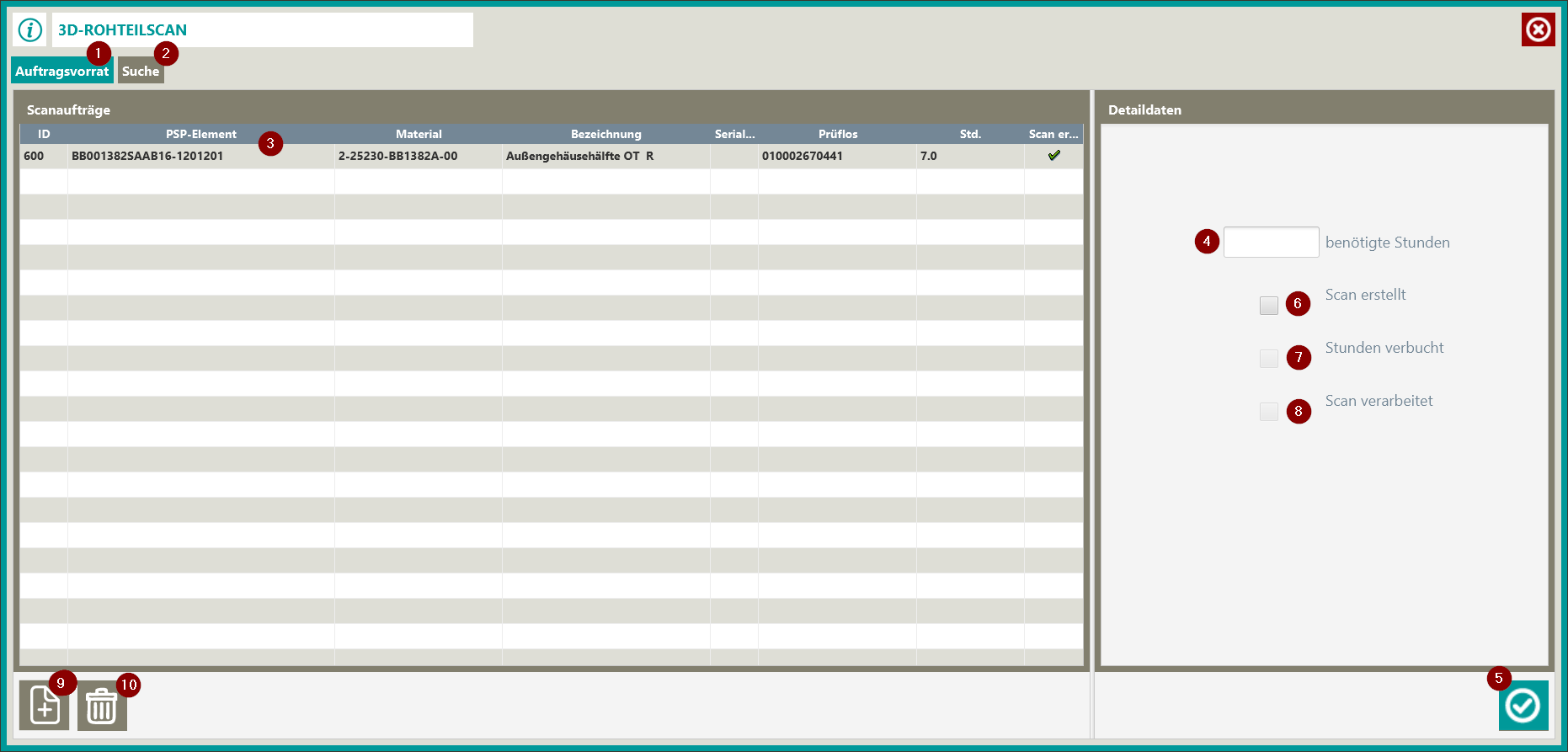 Eingabefeld für die benötigten Stunden für den Rohteilscan (kann beliebig oft gändert werden bis der Status "Scan erstellt" gesetzt wurde) Eingabe speichern mit Button 5 | |