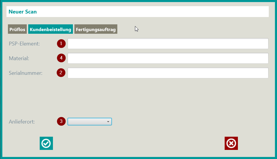• Anlegen von neuen Scanaufträgen für Prüflos (wenn noch kein Fertigungsauftrag existiert) / Kundenbeistellung (freie Eingabe von PSP, Materialnummer, Serialnummer) / Fertigungsauftrag