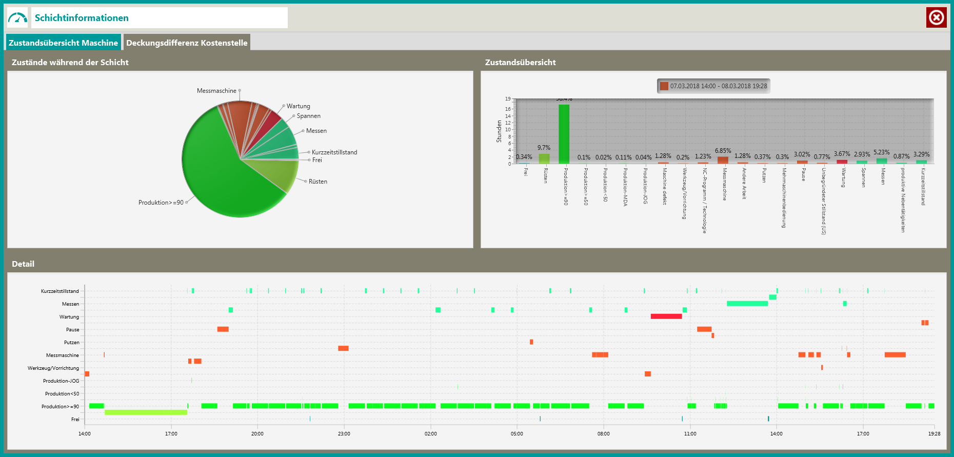 In den oberen beiden Kacheln der Zustandsübersicht sind die Zustände während der Schicht in einem Kreis- und Balkendiagramm dargestellt. In der unteren Kachel sind die Zustände detailliert zu betrachten. So ist in dieser Kachel z.B. aufgeführt über welchen Zeitraum sich ein Zustand in der Schicht erstreckt hat. Zustände an einer Maschine können z.B. Rüsten, Wartund oder Produktion sein.