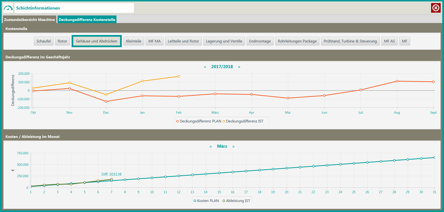 Hier kann oben die Kostenstelle ausgewählt und die Deckungsdifferenz im Geschäftsjahr bzw. die Kosten im Monat der jeweiligen Kostenstelle betrachtet werden.