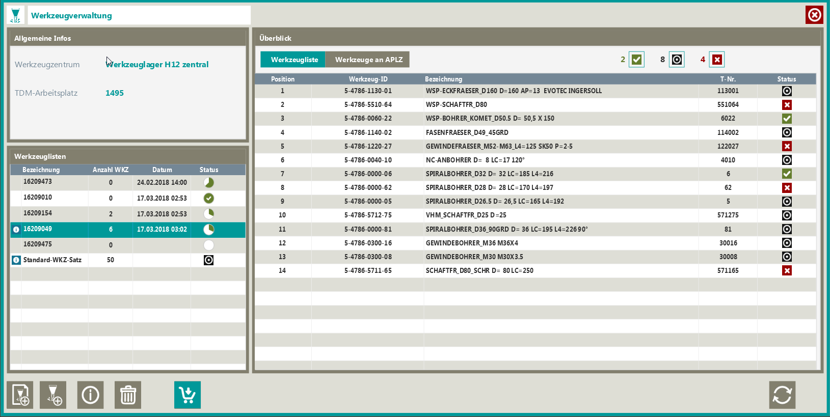 Auf der rechten Seite gibt der Bereich Überblick den Inhalt der im Bereich Werkzeuglisten selektierten Werkzeugliste, sowie den Status der einzelnen Werkzeuge wieder. Werkzeuge können einen der folgenden Status annehmen: