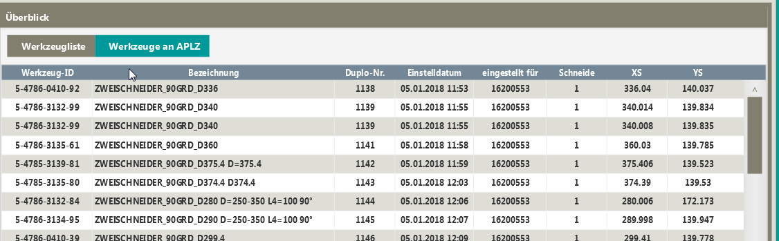 Zusätzlich besteht die Möglichkeit, sich im Bereich Überblick alle an die Maschine gebuchten Werkzeuge inklusive der Vermessungswerte (Schneidenpunkt, Länge, Radius), dem Zeitpunkt der Vermessung und für welches Programm vermessen wurde anzuschauen. Dazu muss die Schaltfläche