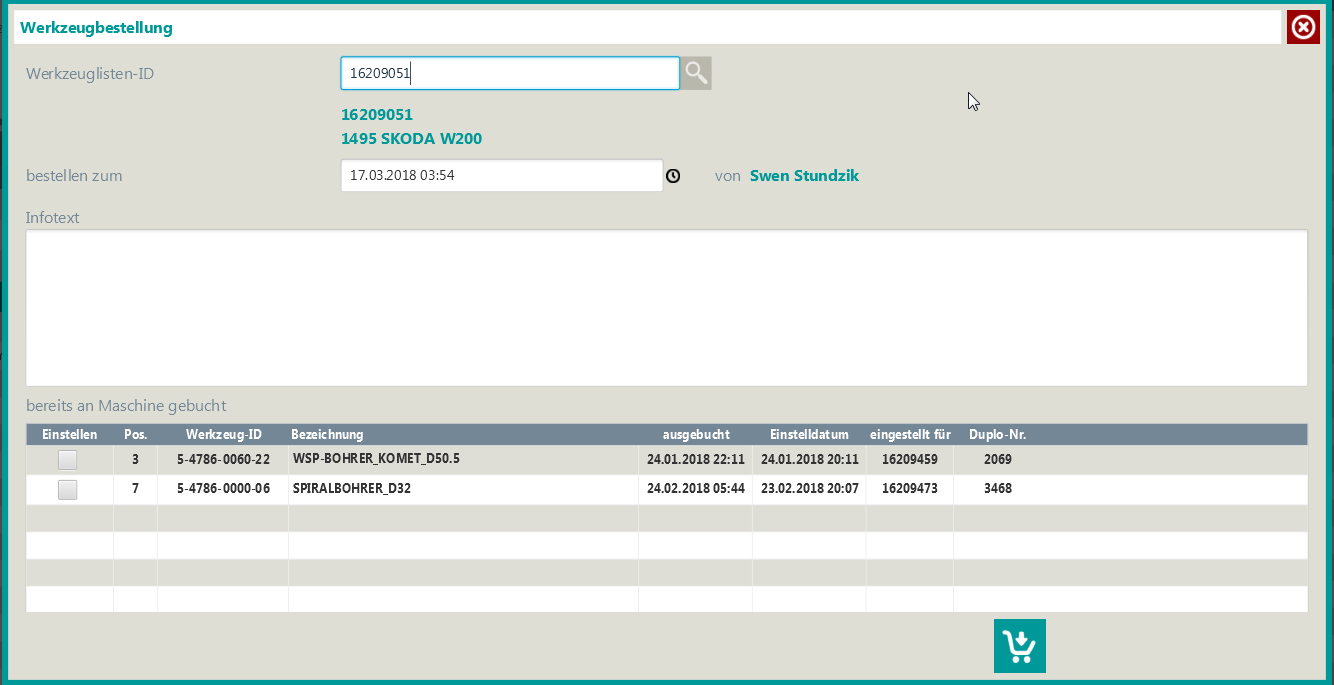 wird der entsprechende Datensatz aus TDM geladen. Anschließend muss der Termin, zu welchem das/die Werkzeug(e) benötigt werden eingetragen werden. Dabei muss die festgelegte Vorlaufzeit eingehalten werden. Zusätzlich besteht die Möglichkeit, dem Voreinstellraum eine Information zukommen zu lassen. Im unteren Bereich des Fensters werden alle Werkzeuge der zu bestellenden Liste angezeigt, welche sich bereits aus vorherigen Lieferungen an der Maschine befinden. Diese werden nicht nochmals bestellt, es sei denn, das jeweilige Werkzeug wird durch den Anwender in der Spalte "Einstellen" markiert. Nach Betätigung des Bestellen-Buttons