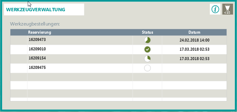 Die Dashboard-Kachel zeigt die vorhandenen Werkzeugreservierungen, sowie deren Status und den Zeitpunkt, zu welchem die Bestellung benötigt wird.